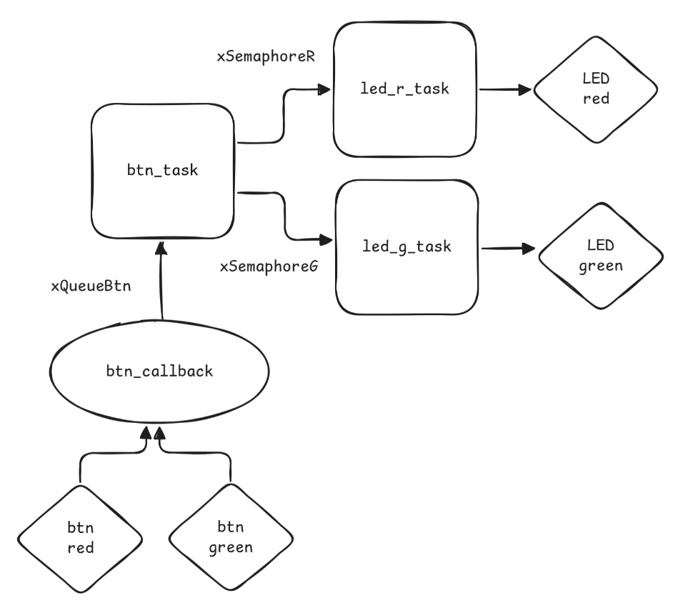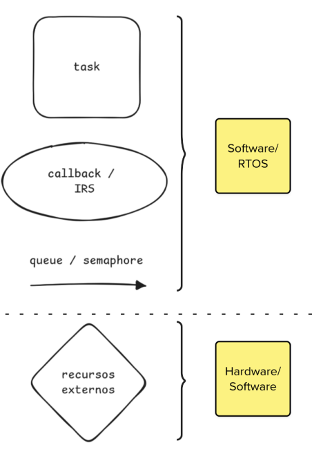 - Setas → Filas e semáforos (mecanismos de sincronismo entre tasks e ISRs)