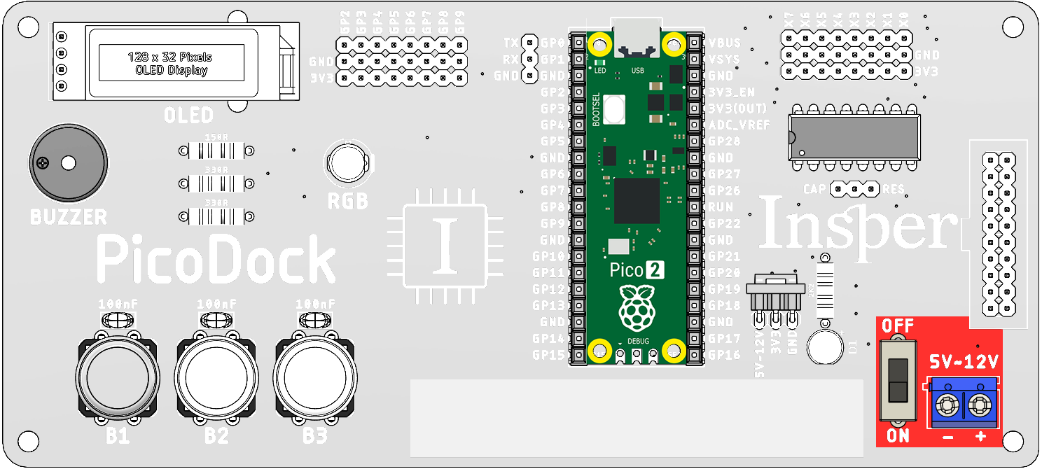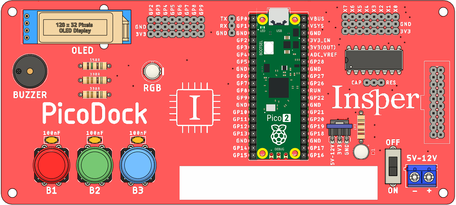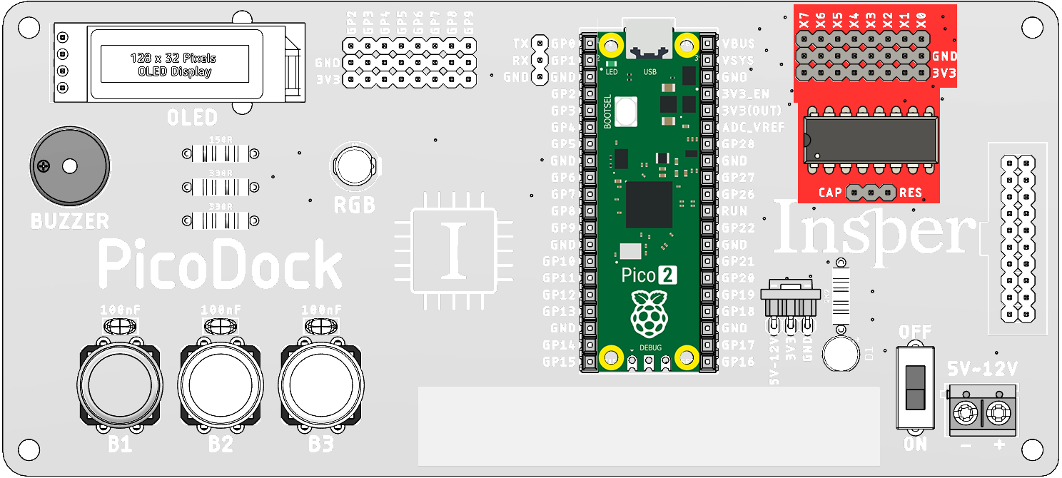 A PicoDock é uma placa de expansão desenvolvida para ser utilizada com a Raspberry Pi Pico, oferecendo acesso simplificado a diversos componentes eletrônicos já integrados.