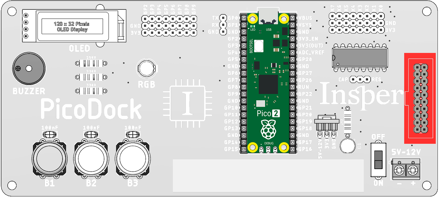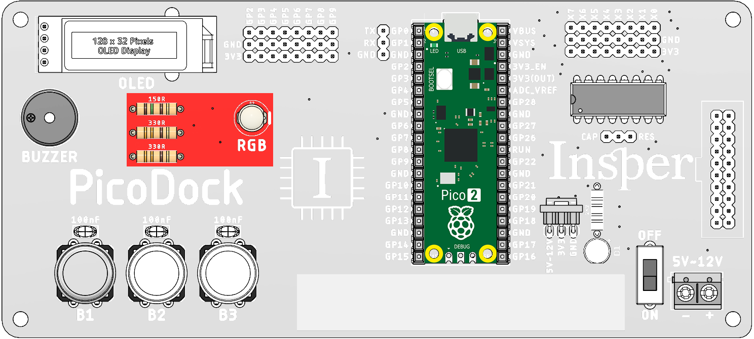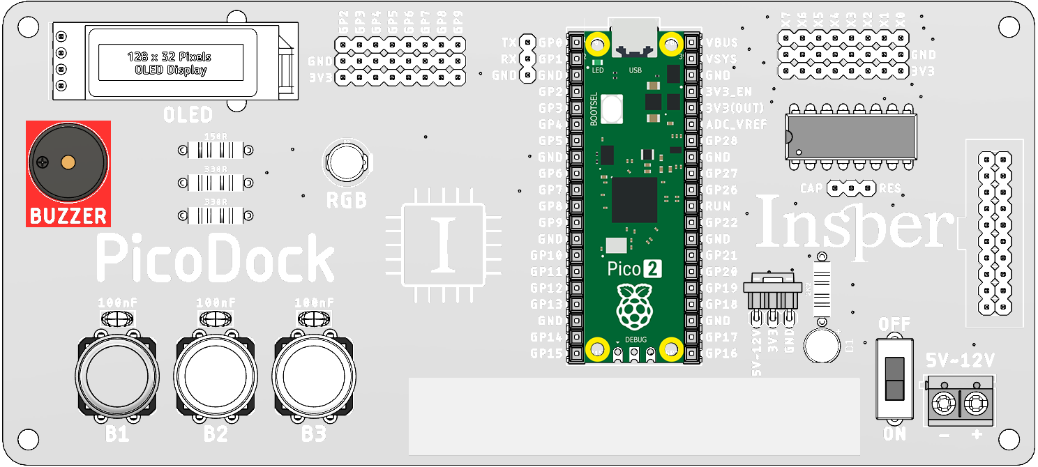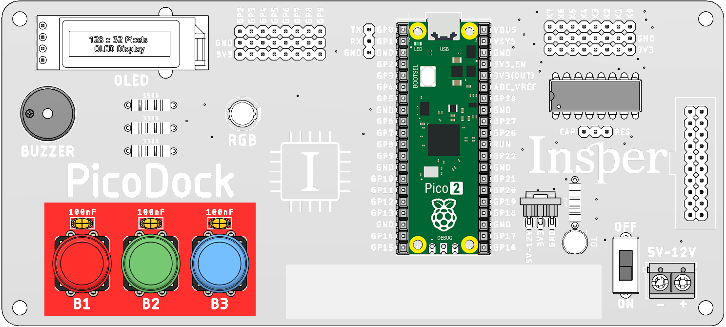 A PicoDock é uma placa de expansão desenvolvida para ser utilizada com a Raspberry Pi Pico, oferecendo acesso simplificado a diversos componentes eletrônicos já integrados.