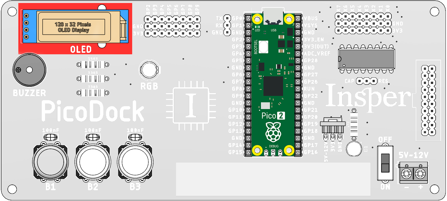 A Raspberry Pi Pico pode ser encaixada diretamente no soquete da PicoDock, onde todos os componentes ficam disponíveis sem a necessidade de conexão adicional, são os principais recursos:
