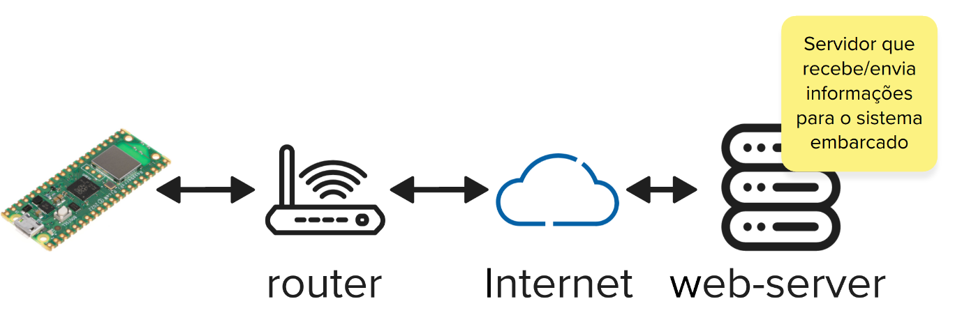 O sistema embarcado pode se comportar de duas maneiras, como um web server ou como um cliente, normalmente a segunda opção é a mais utilizada por limitações e seguranças da rede (o seu roteador bloqueia que qualquer dispositivo externo a sua rede se conecte em um dispositivo interno).