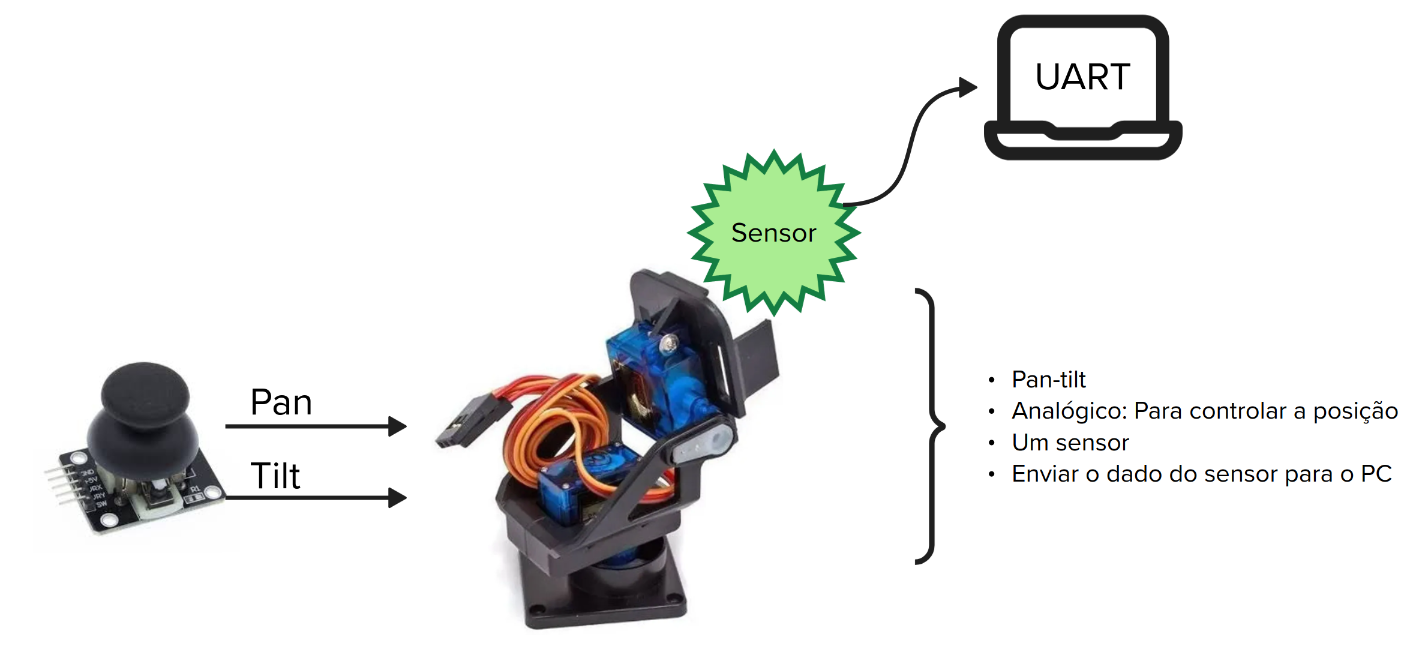 Neste laboratório, iremos criar um sistema embarcado capaz de ajustar a posição de um conjunto pan-tilt (dois servomotores) através de uma interface gráfica no PC, além de exibir em tempo real o gráfico da leitura de um sensor analógico.