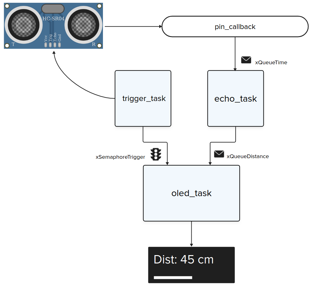 pin_callback: Função callback do pino do echo.trigger_task: Task responsável por gerar o trigger.echo_task: Task que faz a leitura do tempo que o pinoechoficou levantado.oled_task: Task que exibe a informação da distancia no display.- Faz uso de dois recursos,