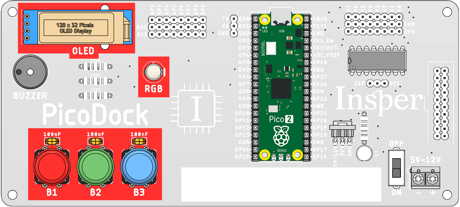 A pico-dock é um projeto interno do laboratório que viza facilitar o uso de componentes externos a rasp pico, minimizando o trabalho de termos que conectar coisas a pico e agilizando o processo de desenvolvimento de projetos.